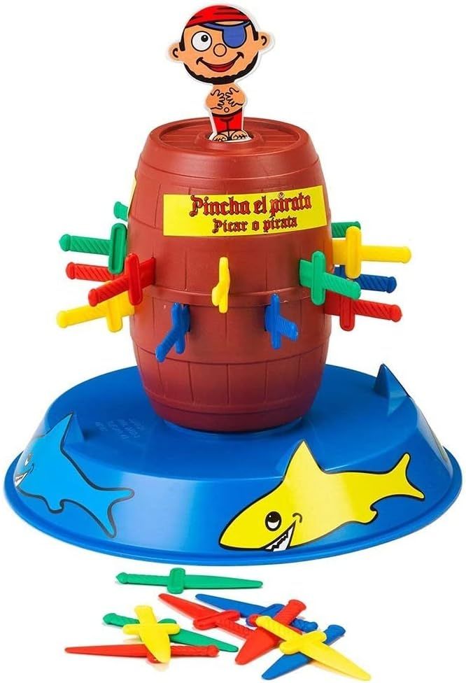 Wer wird den Piraten aus seinem Versteck locken? Finde es heraus mit dem neuen Piraten-Popper-Spiel von Falomir! Hol dir dieses lustige neue Brettspiel, fordere deine Freunde heraus und erlebe ein fantastisches Piratenabenteuer. So wird gespielt: Platziere den Piraten einfach im Fass, drehe es um und die Spieler stecken abwechselnd ihre Schwerter hinein. Wer den Piraten zum Springen bringt, gewinnt! Hergestellt in Spanien. Empfohlenes Alter: ab 3 Jahren. Inhalt: 1 Spielbasis zum Befestigen des Fasses, 1 Pirat, 24 Plastikschwerter (6 rote, 6 gelbe, 6 grüne und 6 blaue) sowie Aufkleber zur Dekoration. Spieleranzahl: 1 oder mehr Spieler. Ungefähre Maße des Fasses mit Spielbasis: 19 cm hoch, 24 cm breit und 24 cm tief. Ungefähre Maße des Piraten: 9 cm hoch, 4,5 cm breit und 2,5 cm tief. Ungefähre Abmessungen der einzelnen Schwerter: 7,3 cm lang, 2,7 cm breit und 0,2 cm tief.