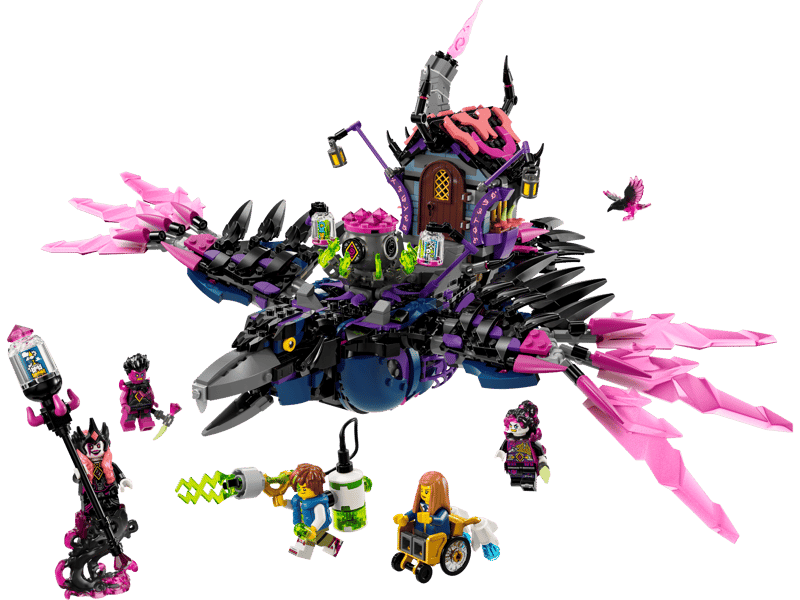 Mit dem LEGO DREAMZzz Bauset „Never Witchs Mitternachtskrähe“ für Kinder ab 9 Jahren können sie ihrer Fantasie freien Lauf lassen. Inspiriert von der TV-Serie, können Kinder mit diesem Set eine imposante Krähe bauen und anschließend zwei spannende Möglichkeiten entdecken, sie umzubauen. Junge Träumer werden viel Spaß daran haben, die berüchtigte Krähe der Never Witch zu erschaffen und sie dann in eine Krähe mit Hütte oder in drei Albtraumkreaturen zu verwandeln: ein wandelndes Haus, eine Kesselspinne und eine Riesenkrähe. Das Dach und die Tür des Spielzeughauses lassen sich öffnen, die Spielzeugspinne hat einen Käfig und bewegliche Beine, und die Spielzeugkrähe hat bewegliche Flügel und Federn. Minifiguren von Matthew, Astrid, Never Witch, Dizzy und Dogan sowie eine Z-Blob-Figur erwecken das Abenteuer zum Leben. Die storybasierte Bauanleitung des Sets lässt Kinder in eine spannende Mission eintauchen: den Traumjägern helfen!