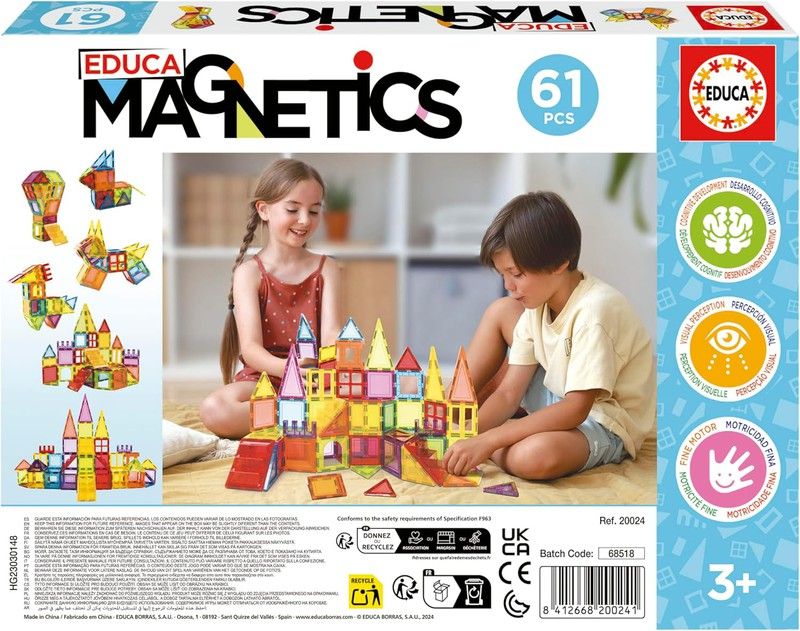 61 3D-Magnetblöcke, mit denen Kinder ab 3 Jahren geometrische Figuren erstellen können. Beim Spielen lernen sie auf natürliche Weise die Prinzipien von Magneten und magnetischer Kraft kennen. S.T.E.M.-Spielzeug Bauen Sie geometrische Figuren und fördern Sie Kreativität, Vorstellungskraft, visuelle Wahrnehmung, Feinmotorik und kognitive Entwicklung. 🧲 61 hochwertige Magnetbausteine, die durch ihre abgerundete Oberfläche für Kinder sicher sind. Erstellen Sie Figuren oder Gebäude und dank der Magnete bleiben sie zusammen. Stimulieren Sie Ihren Geist und Ihre Kreativität: Educa Magnetics sind eine perfekte Aktivität zum Vorstellen, Bauen und Lernen und regen außerdem die Neugier und Fantasie der Kinder an. Enthält 61 Teile aus ABS-Material. 22 Quadrate, 12 gleichseitige Dreiecke, 4 rechtwinklige Dreiecke, 4 spitze Winkeldreiecke, 2 Teile mit vier Fenstern, 3 Rechtecke, 2 Teile mit einem einzelnen Fenster, 2 Teile mit zwei Fenstern, 2 Teile mit einem Bogenfenster und 1 Teil. Lernspiel, empfohlen ab 3 Jahren.