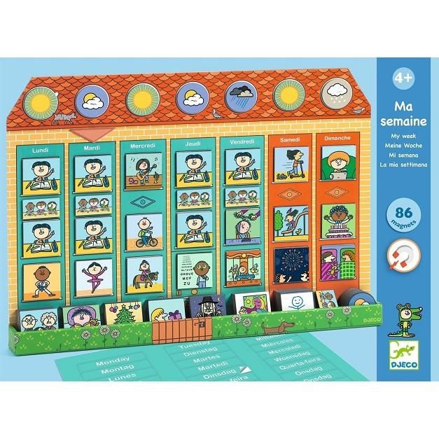 Möchten Sie Ihrem Kind auf spielerische und lehrreiche Weise helfen, seine Woche zu organisieren? Diese Magnettafel von Djeco ist ideal, um ihm Planung und Routinen näherzubringen. Mit einer großen, hausförmigen Tafel, 85 Aktivitätsmagneten und einem vorgeschnittenen Stickerbogen wird Zeitmanagement zum interaktiven Spiel. Mit „Meine Woche“ von Djeco lernen Kinder auf spielerische Weise, sich zu organisieren und die Wochentage zu erkennen! Dieses Lernspiel ist für Kinder ab 3 Jahren geeignet und vermittelt ihnen anhand einfacher und unterhaltsamer Alltagsaktivitäten den Aufbau der Wochentage. Das Set enthält Spielsteine mit Illustrationen, die alltägliche Handlungen wie Schule, Spielen oder Ausruhen darstellen. So können Kinder jeden Tag mit einer bestimmten Aktivität verbinden. Spielerisch entwickeln Kinder Organisations-, Sequenzierungs- und Zeitmanagementfähigkeiten und lernen gleichzeitig spielerisch ihre Wochenroutine kennen.