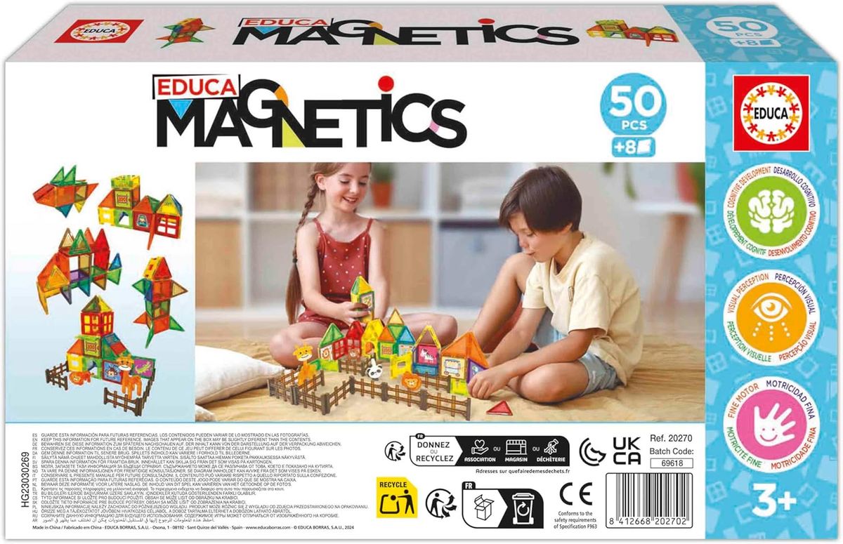 Fünfzig magnetische 3D-Bausteine ermöglichen Kindern ab 3 Jahren das Erschaffen geometrischer Formen. Enthält 4 Tiere und 8 Dekorationskarten. Spielerisch lernen Kinder die Grundlagen von Magneten und Magnetkraft kennen. Ideal zur Förderung der Farb- und Formerkennung. Sie entwickeln ihr räumliches Vorstellungsvermögen und lernen spielerisch. Perfekt als Spielzeug für Vorschulkinder, Schulen und Kindergärten sowie für Familienspiele zu Hause.